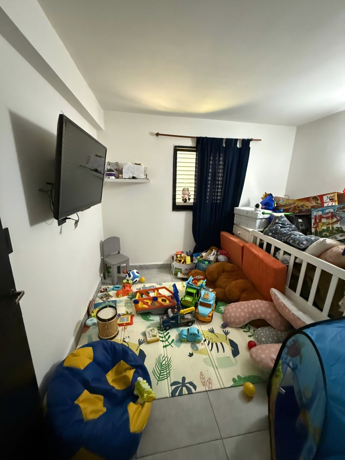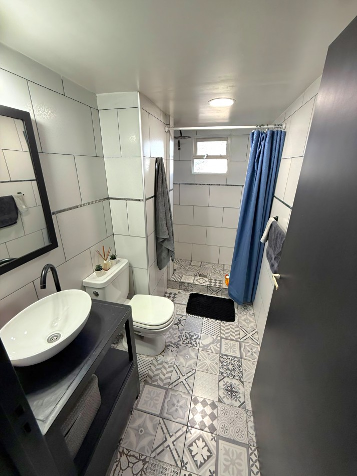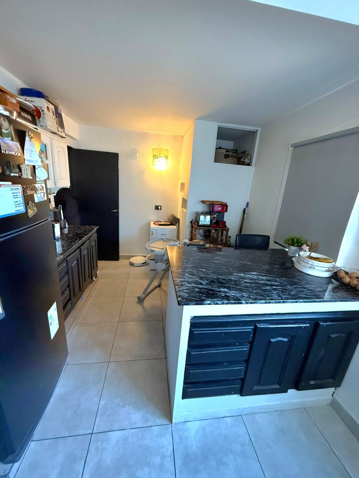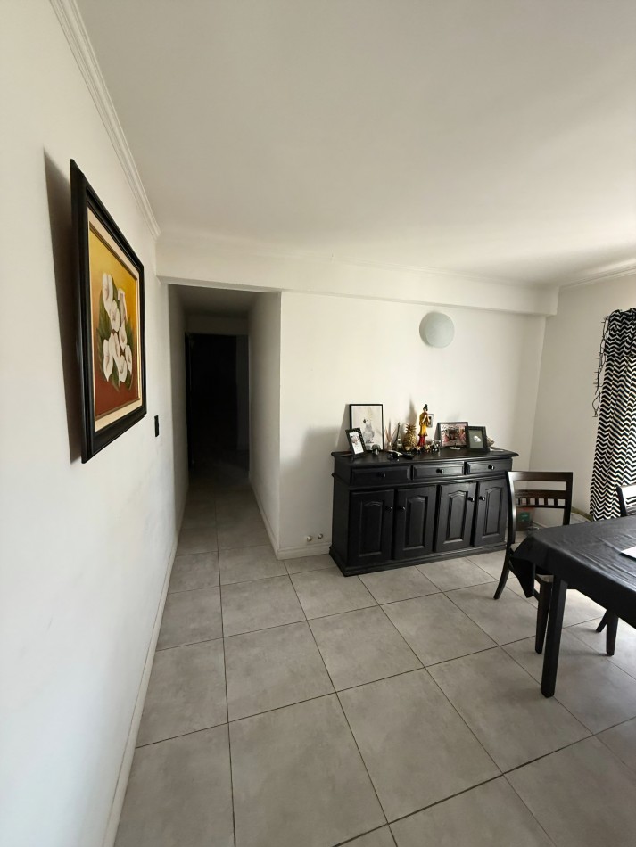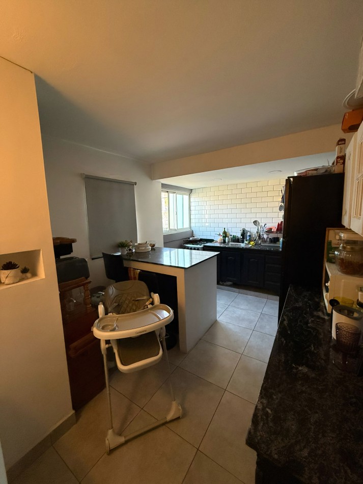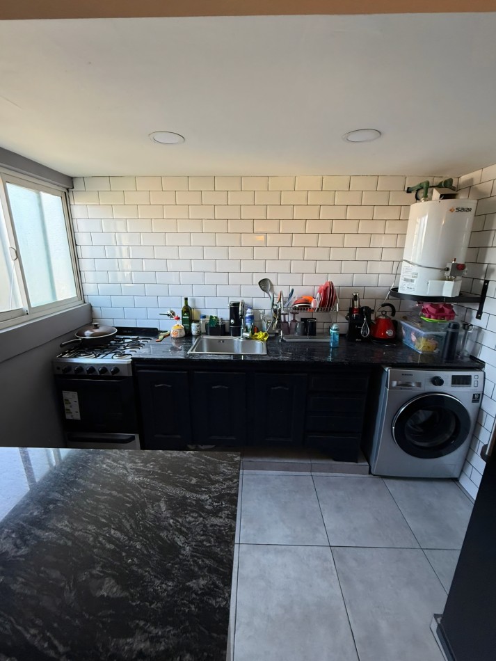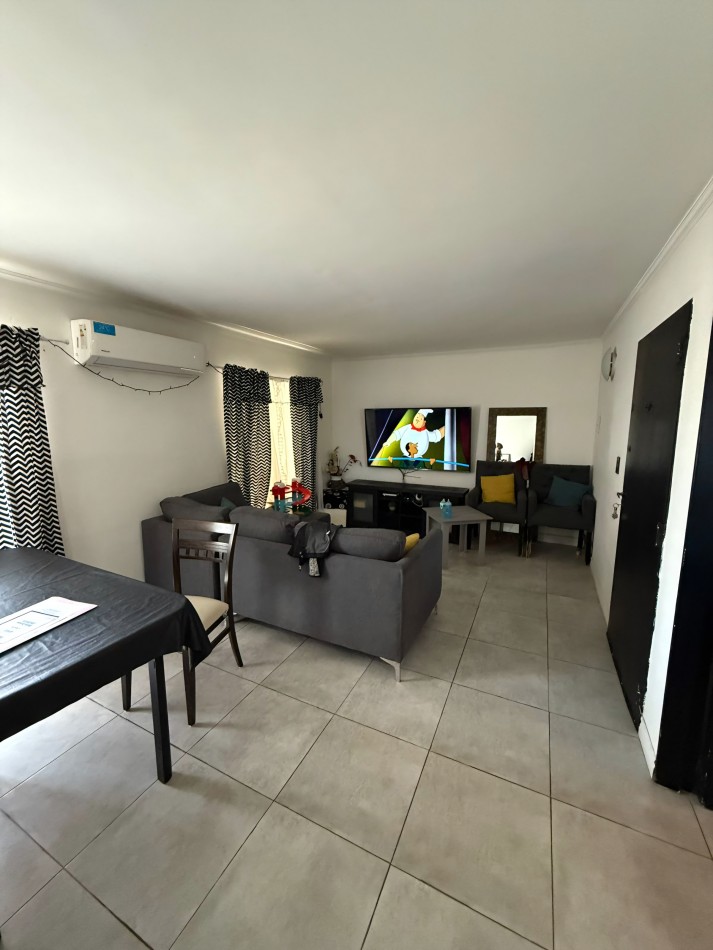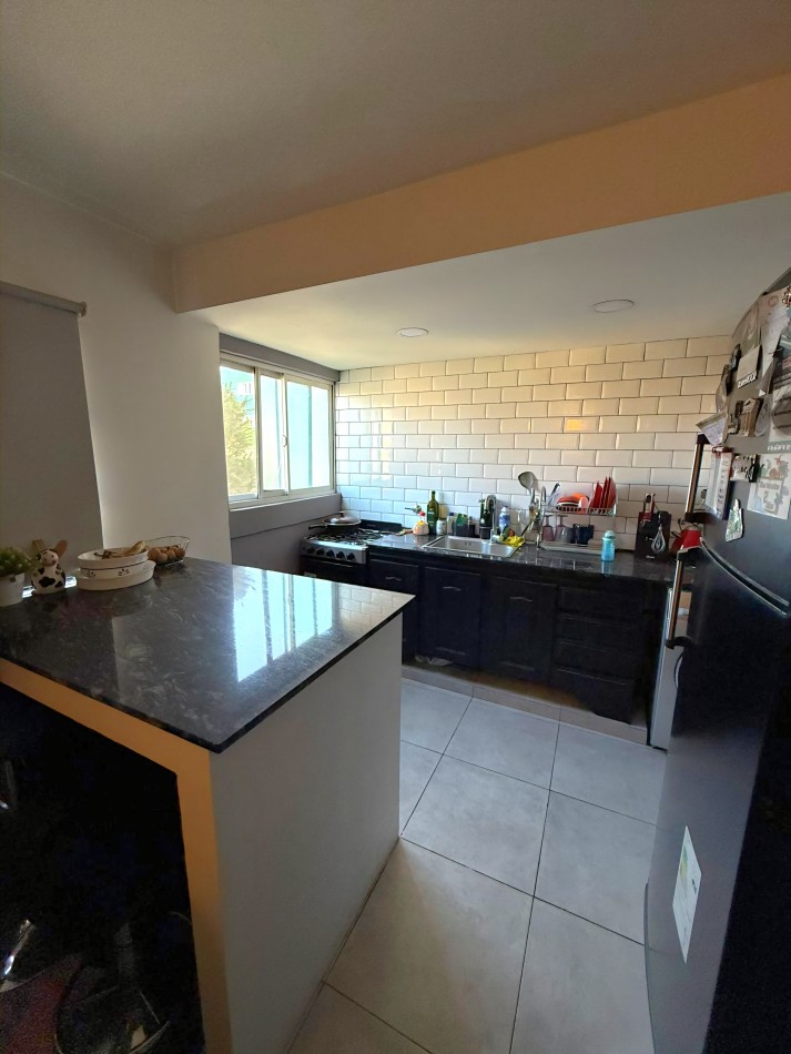 Living comedor con salida a balcón, cocina amoblada con isla, 3 dormitorios y un baño completo.