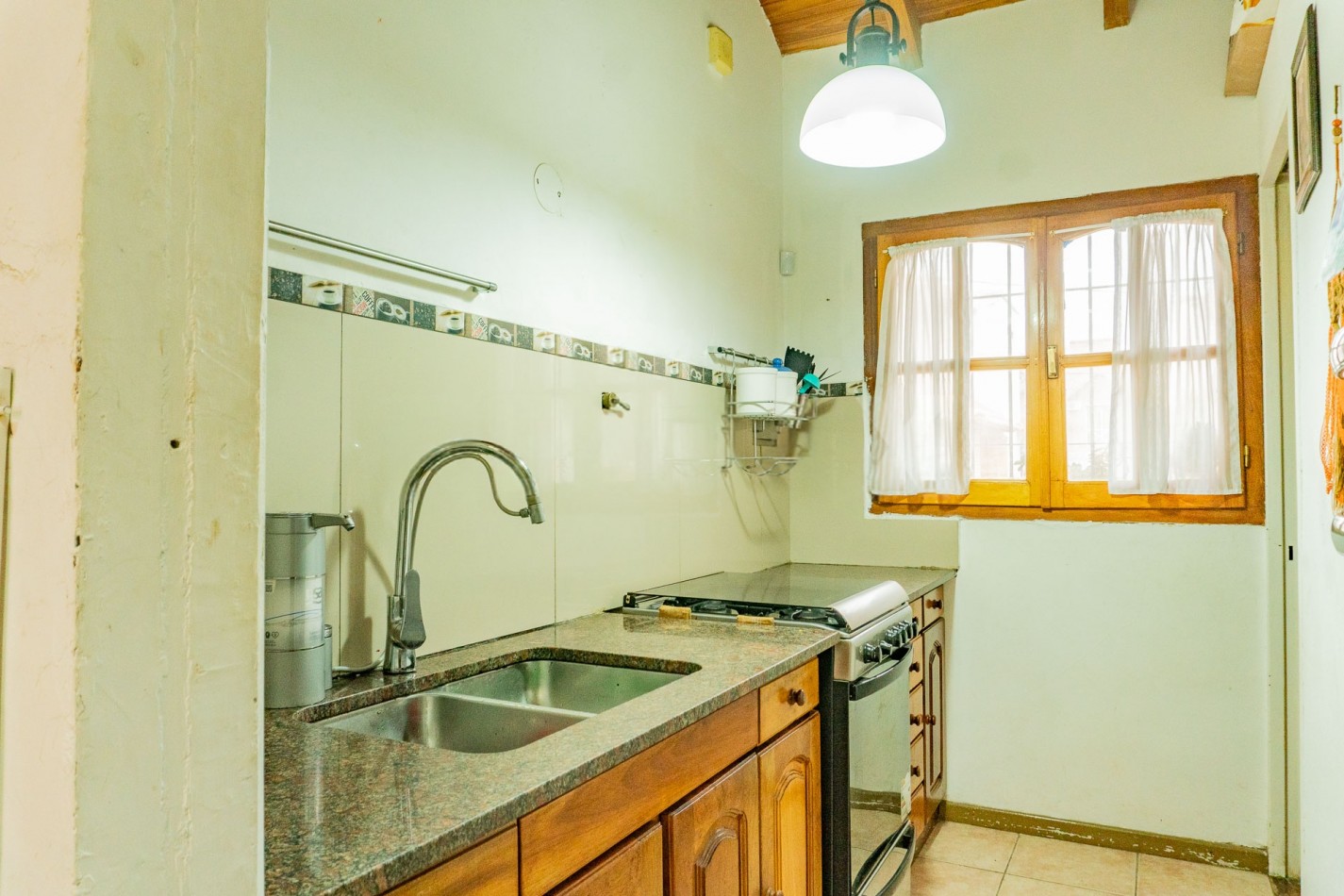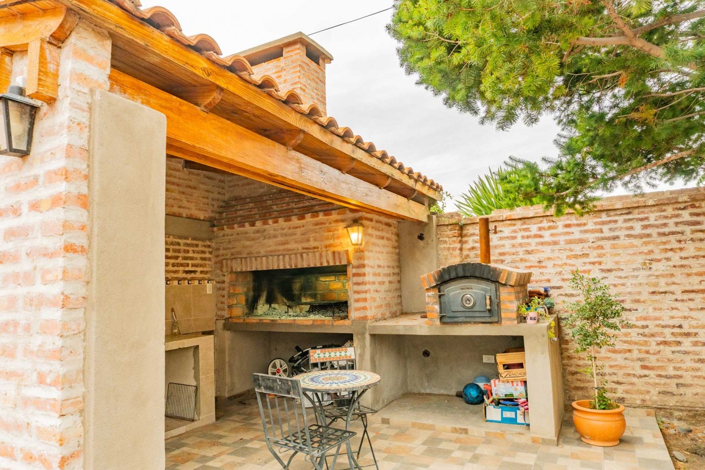 Living-comedor, cocina, toilette, dos dormitorios con placar, baño completo, quincho semicubierto con parrilla, patio trasero cerrado.